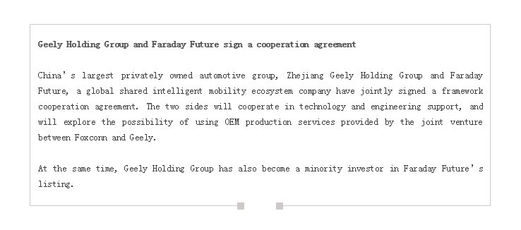 根據(jù)官方公示信息顯示:浙江吉利控股集團(tuán)有限公司與美國共享智能出行生態(tài)系統(tǒng)公司Faraday Future簽署框架合作協(xié)議,雙方計劃在技術(shù)支持和工程服務(wù)領(lǐng)域展開合作,并探討由吉利與富士康的合資公司提供代工服務(wù)的可能性。同時作為財務(wù)投資人,吉利控股集團(tuán)還參與了Faraday Future SPAC上市的少量投資。