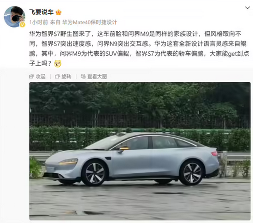 另一名汽車博主 @飛要說車 也放出了另一款智選車 —— 智界 S7 的實(shí)車圖。其稱,智界 S7 和問界 M9 采用同樣的家族設(shè)計(jì),但風(fēng)格取向不同:智界 S7 突出“速度感”,問界 M9 突出“交互感”。
