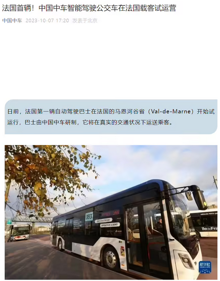該智能駕駛公交車已于 2022 年 12 月 7 日在法國巴黎郊區(qū)完成試運行。中車電動公司還與多家法國企業(yè)合作,優(yōu)化了“路口優(yōu)先通行”技術,將車輛在整個路段運行時間從 40 分鐘縮短至 23 分鐘。2024 年,中車電動公司將提供 3 臺 12 米智能駕駛車到法國巴黎開展線路運營。