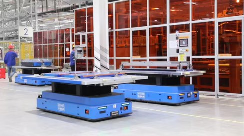 此外,車間內(nèi)配備了 100 多臺 AGV 小車(注:Automated Guided Vehicle,自動導引運輸車)用來代替?zhèn)鹘y(tǒng)輸送輥道,可節(jié)省約 30% 人力,生產(chǎn)設(shè)備也為迭代升級后的 2.0 版本。