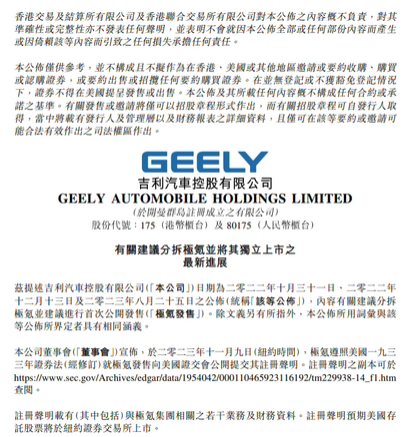 11 月 10 日消息,吉利汽車今日在港交所公告稱,極氪已向美國證交會提交注冊聲明,預(yù)期極氪美國存托股票將于紐約證券交易所上市,股票代碼為“ZK”。
