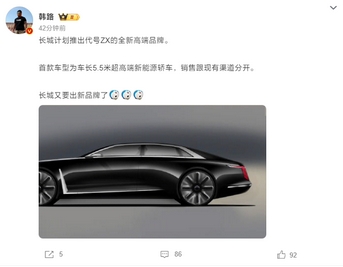 2 月 2 日消息,據(jù)多家車(chē)媒、汽車(chē)博主消息,長(zhǎng)城汽車(chē)計(jì)劃推出一個(gè)代號(hào)為“ZX”的全新品牌,其首款車(chē)型將是一款 D + 級(jí)的高端新能源轎車(chē),車(chē)長(zhǎng)可達(dá) 5500mm。