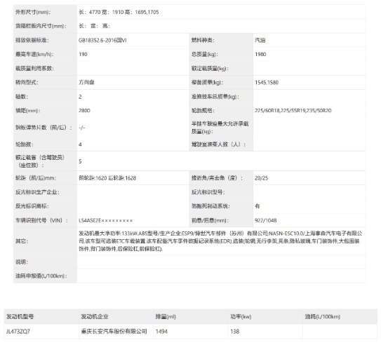 動力方面,新車搭載了一臺排量為 1494ml 的發(fā)動機,最大功率 138kW。該車目前已知只有燃油版本,而根據長安汽車過往的產品規(guī)劃,后續(xù)有可能看到這款車的插混版本以“長安啟源”旗下車型的身份推出。