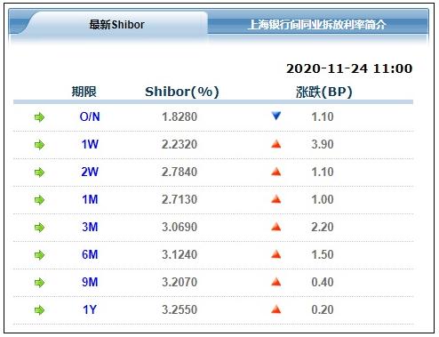 24日銀行間市場(chǎng)除隔夜利率下行,其他期限利率有所上行。24日發(fā)布的上海銀行間同業(yè)拆放利率(Shibor)顯示,隔夜利率為1.828%,較上一個(gè)交易日下行1.1個(gè)基點(diǎn);7天期、14天期、一年期利率分別為2.232%、2.784%、3.255%,分別上行3.9個(gè)、1.1個(gè)和0.2個(gè)基點(diǎn)。