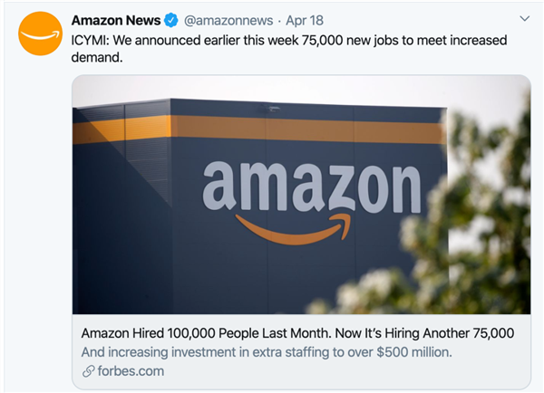 2020 年 3 月,美國(guó)勞工部公布的調(diào)查數(shù)據(jù)顯示,受新冠肺炎疫情在美國(guó)蔓延影響,各行業(yè)普遍停產(chǎn)停工,美國(guó) 3 月失業(yè)率從上月的 3.5% 升至 4.4%,非農(nóng)業(yè)部門(mén)削減就業(yè)崗位 70.1 萬(wàn)個(gè),而亞馬遜電商業(yè)務(wù)由于線上訂單的需求激增,緊急擴(kuò)充勞動(dòng)力,不斷增加勞動(dòng)崗位。