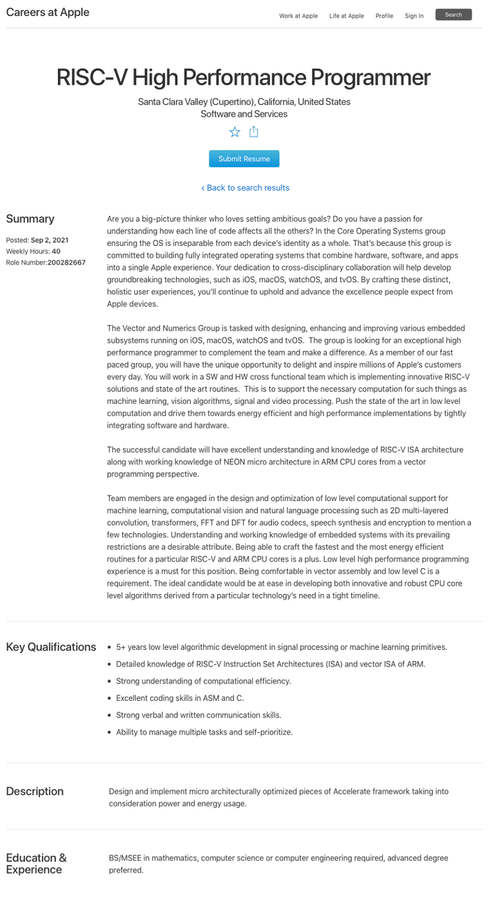 若順利入職,應(yīng)聘者將加入蘋果旗下的“矢量數(shù)值事業(yè)部”(Vector and Numerics Group)。