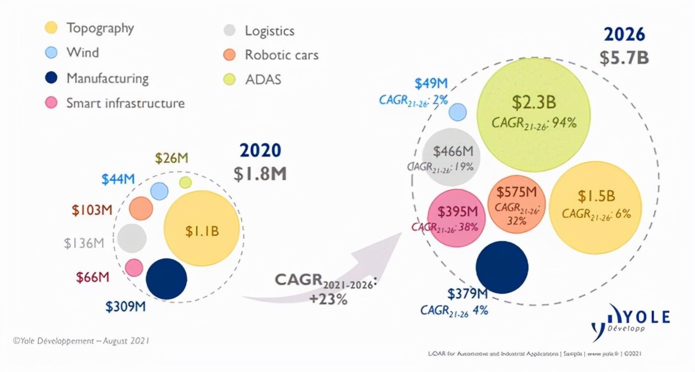 據 Yole 預測,到 2026 年激光雷達市場規(guī)模將達到 57 億美元,2020-2026 年,年復合增長率將達到 21%,細分市場里,智慧城市增速最快將達到 35%;自動駕駛出租車和巴士增速為 33%;智能物流為 23%。
