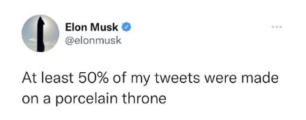 馬斯克表示,“At least 50% of my tweets were made on a porcelain throne(我至少50%的推特是在一個瓷制寶座上寫的)”。他還解釋到,“這樣會給我慰藉。”