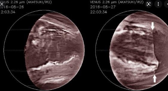 2016 年,已經(jīng)圍繞金星運(yùn)行了近 10 年的,日本宇宙航空研究開發(fā)機(jī)構(gòu)的“破曉號”金星氣象衛(wèi)星,首次發(fā)現(xiàn)了一種大氣波,延伸到這顆灼熱的行星上。對這一奇怪現(xiàn)象的后續(xù)觀測,是使用美國宇航局位于夏威夷的紅外望遠(yuǎn)鏡設(shè)備進(jìn)行的,探測了金星大氣層的中下層。