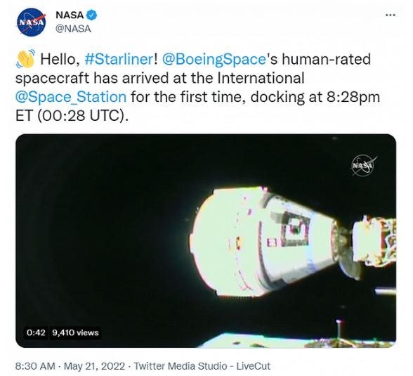 美國(guó)國(guó)家航空航天局(NASA)官方推特5月20日發(fā)布消息稱,波音公司星際客船(Starliner)于美國(guó)東部時(shí)間20日20:28(北京時(shí)間5月21日8:28)與國(guó)際空間站對(duì)接。