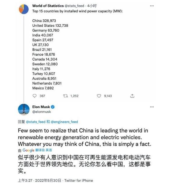 馬斯克對此發(fā)布推文稱:“似乎很少有人意識到,中國在可再生能源發(fā)電和電動汽車方面處于世界領(lǐng)先地位。不管你怎么看待中國,這都是事實(shí)。”