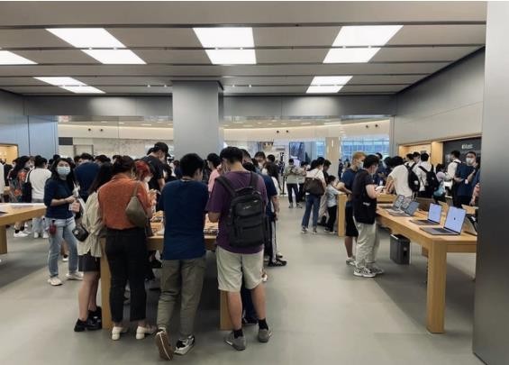 上午11點(diǎn),深圳益田假日廣場(chǎng)蘋果店門口大排長(zhǎng)龍,人群繞著圍欄來(lái)回幾圈,從門店入口延伸至商場(chǎng)中心,估計(jì)有約200人。為維持秩序,蘋果零售店員穿梭在隊(duì)伍中,為消費(fèi)者答疑溝通。店員表示,目前門店內(nèi)iPhone 14機(jī)型均有現(xiàn)貨,可線下購(gòu)買,但熱銷的Pro與Pro Max機(jī)型暫無(wú)現(xiàn)貨,今日僅接受預(yù)約提貨。