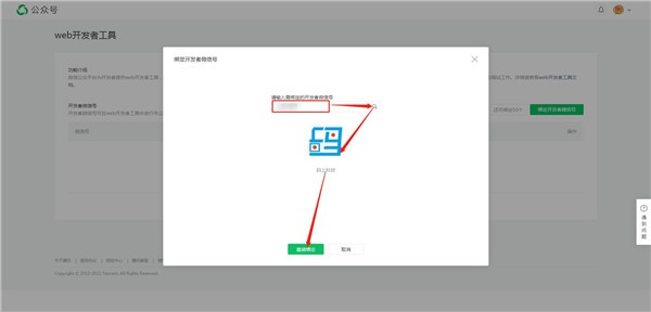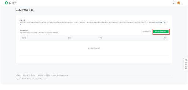 3.進(jìn)入到Web開發(fā)者工具菜單里之后,我們就可以點擊綁定開發(fā)者微信號按鈕來添加開發(fā)者,每個微信公眾號可以添加50個開發(fā)者。