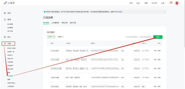 2.在左側(cè)菜單功能處找到訂閱消息,點(diǎn)擊進(jìn)入后就可以看到添加訂閱消息的地方了,不同的類目可以添加不同的訂閱消息類型,要先給小程序設(shè)置好類目再設(shè)置模板消息。