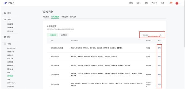 3.點(diǎn)擊選用按鈕就可以去搜索自己想要的訂閱消息了,在輸入框中輸入消息標(biāo)題,然后點(diǎn)擊搜索按鈕搜索出自己想要的消息,點(diǎn)擊選用進(jìn)入訂閱消息設(shè)置。