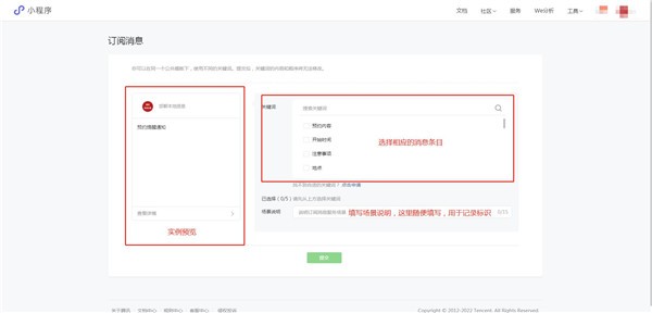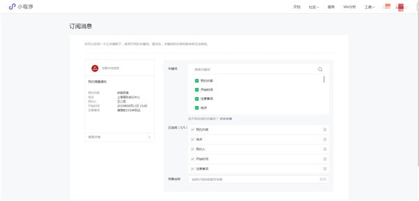 4.比如我們選擇預(yù)約提醒通知,點(diǎn)擊選用進(jìn)入設(shè)置,選好程序需要的消息類型條目,例如我們選擇:預(yù)約內(nèi)容,地點(diǎn),預(yù)約人,開始時(shí)間,注意事項(xiàng),就再這些條目前選上√,保存即可添加成功。