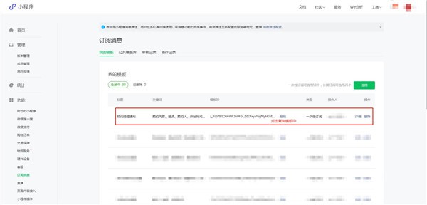 5.添加成功后我們就可以看到訂閱消息列表就有了這一條剛添加的信息,點(diǎn)擊復(fù)制模板ID,粘貼到程序里需要的位置即可使用成功。