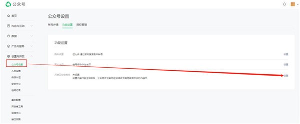 2.進(jìn)入到公眾號后臺點(diǎn)擊左側(cè)菜單 設(shè)置與開發(fā)里的公眾號設(shè)置,然后就可以看到設(shè)置JS安全域名的位置。