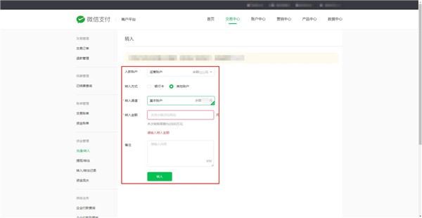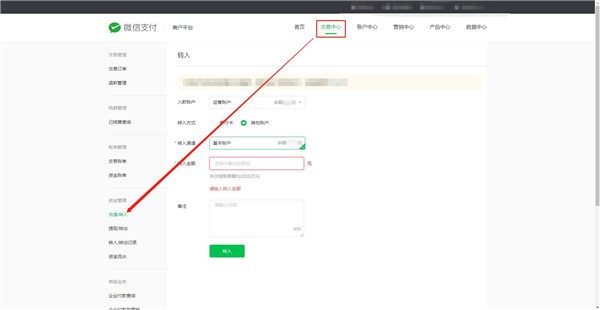 2.進入到支付平臺后,點擊橫向菜單的交易中心,然后在左側(cè)菜單中點擊充值/轉(zhuǎn)入,就可以看到操作頁面了
