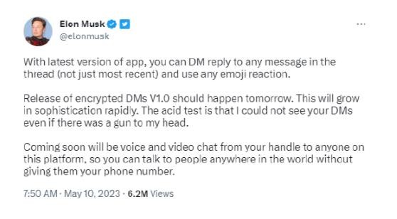 馬斯克表示,推特周三將上線加密私信,不過并未透露通話是否加密。