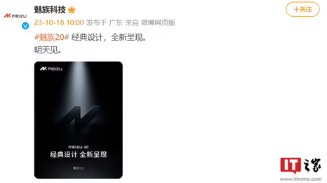 10 月 18 日消息,魅族科技今日發(fā)布預熱微博:魅族 20 經(jīng)典設計,全新呈現(xiàn),明天見。