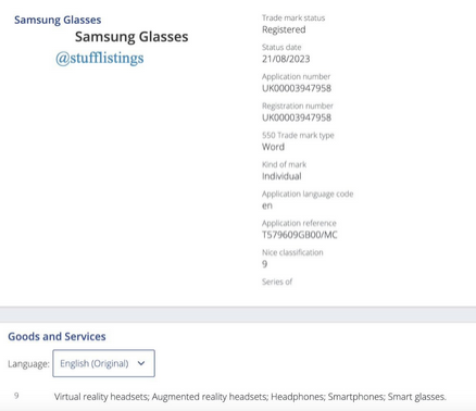 而根據(jù) X 平臺用戶 Stufflistings 消息,這款 XR 頭顯商標已經(jīng)現(xiàn)身數(shù)據(jù)庫,名為“Samsung Glasses”。