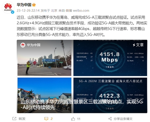 華為官方介紹稱,此次試點選在青島五四廣場、威?;鹁姘私謨纱鬅衢T旅游景區(qū)。通過在現(xiàn)網 2.6G 站點基礎上增加 4.9G 宏站部署,實現(xiàn)了 260M 可用超大帶寬。