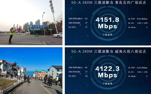現(xiàn)網實測數(shù)據(jù)顯示,青島、威海兩地下行峰值速率分別可達 4151.8Mbps 和 4122.3Mbps,相較傳統(tǒng) 5G 網絡提升顯著。
