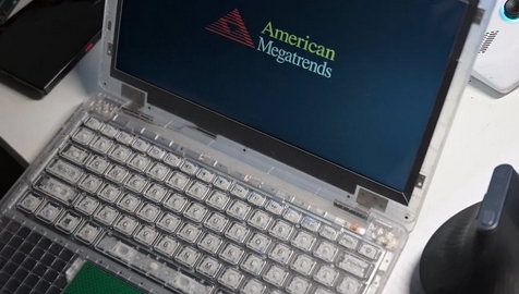 這臺(tái)筆記本電腦出廠時(shí)沒有操作系統(tǒng),沒有 USB 接口,并且還有一個(gè)令人頭疼的 BIOS,只要斷電就會(huì)自動(dòng)重置,這使得刷寫新 BIOS 變得格外困難,啟動(dòng)時(shí)還會(huì)出現(xiàn)一個(gè)鎖定的密碼界面。不過,對(duì)于喜愛透明塑料外殼電子產(chǎn)品的人來說,這臺(tái)電腦的外觀還是挺酷的。