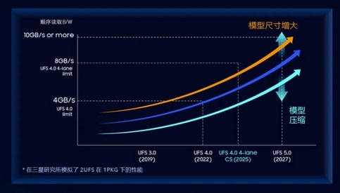 三星表示,近年來,端側(cè)(End-to-End)人工智能在智能手機市場上熱度很高為了實現(xiàn)大語言模型的端側(cè)運行,研究人員針對模型尺寸開展了多種研究眾所周知,輕量化服務(wù)的實現(xiàn)需要縮小存儲和內(nèi)存的尺寸,提高帶寬??紤]到端側(cè)大語言模型服務(wù)未來的發(fā)展,現(xiàn)在就必須開始提升 UFS 接口速度。