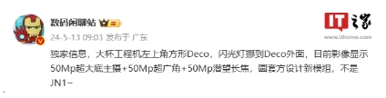 根據(jù)該博主爆料,這款工程機(jī)配備左上角方形 Deco,閃光燈挪到 Deco 外面,目前影像顯示為 50Mp 超大底主攝 + 50Mp 超廣角 + 50Mp 潛望長(zhǎng)焦,圓套方設(shè)計(jì)新模組,不是 JN1 傳感器。