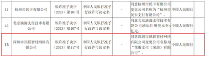 中國人民銀行 10 月 13 日更新了非銀行支付機構(gòu)重大事項變更許可信息,同意深圳市訊聯(lián)智付網(wǎng)絡(luò)有限公司變更公司名稱為“花瓣支付(深圳)有限公司”。
