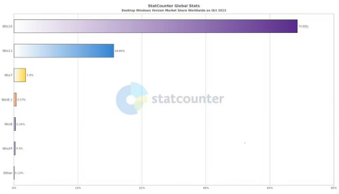 根據(jù) Statcounter 的數(shù)據(jù),截至 2023 年 10 月,全球 PC 上安裝了 Windows 11 的比例約為 23%,而 Windows 10 的比例為 71%。這是一個(gè)巨大的差距,尤其是考慮到微軟計(jì)劃在大約兩年后結(jié)束對(duì) Windows 10 系統(tǒng)的支持時(shí)。