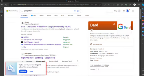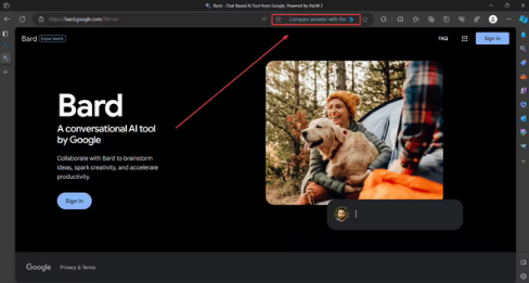 這個變化出現(xiàn)在 Edge 最新的 Canary(v. 120.0.2168.0)版本中,如果用戶在最新版本上搜索“google bard”,就會彈出一個推薦 Bing Chat 的廣告。打開 Bard 后,地址欄里還會出現(xiàn)一個 Bing 圖標,建議用戶在分屏模式下打開 Bing Chat,并比較它們的回答。