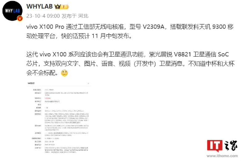 在本月初,博主 @WHYLAB 發(fā)文表示 vivo X100 Pro 通過了工信部無線電核準(zhǔn),型號(hào)為 V2309A,并稱該機(jī)“有望”支持衛(wèi)星通訊功能,搭載紫光展銳 V8821 衛(wèi)星通信 SoC 芯片,支持雙向文字、圖片、語(yǔ)音、視頻(開發(fā)中)衛(wèi)星消息。
