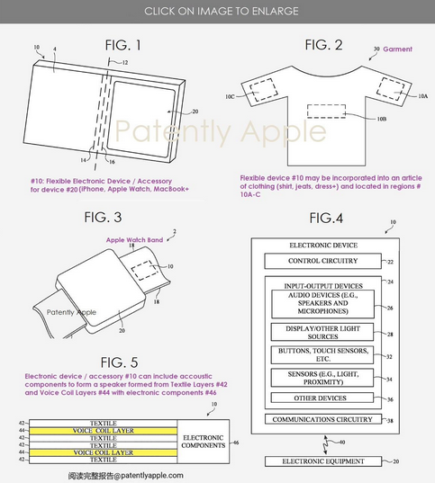 根據(jù)專利描述,通過在織物中嵌入聲學(xué)組件(例如揚聲器)和發(fā)光組件(例如屏幕和其他組件),從而進一步擴展電子設(shè)備的應(yīng)用范圍。