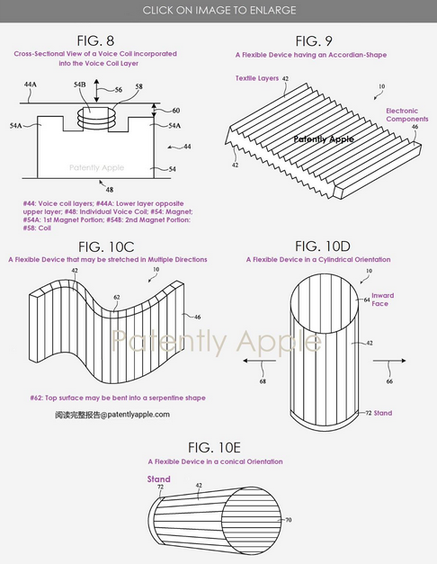 在此附上蘋果在專利中提及的一個設(shè)計構(gòu)想,這種柔性揚聲器由織物層和音圈層組成,可以折疊成任何形狀,并可以進行展開構(gòu)造、收縮構(gòu)造、彎曲構(gòu)造、圓柱形構(gòu)造和 / 或圓錐形構(gòu)造等。