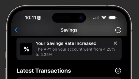 1 月 5 日消息,蘋(píng)果公司今天通知美國(guó) Apple Card Savings Account,表示儲(chǔ)蓄賬戶(hù)年利率從 4.25% 上調(diào)至 4.35%,距離上次調(diào)價(jià)(12 月 21 日)僅相隔 15 天。