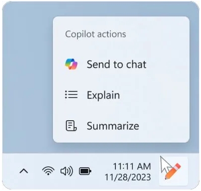 用戶懸停到右下角的 Copilot 按鈕之后,就會(huì)顯示菜單,列出用戶可以采取的操作例如總結(jié)或解釋復(fù)制的文本。