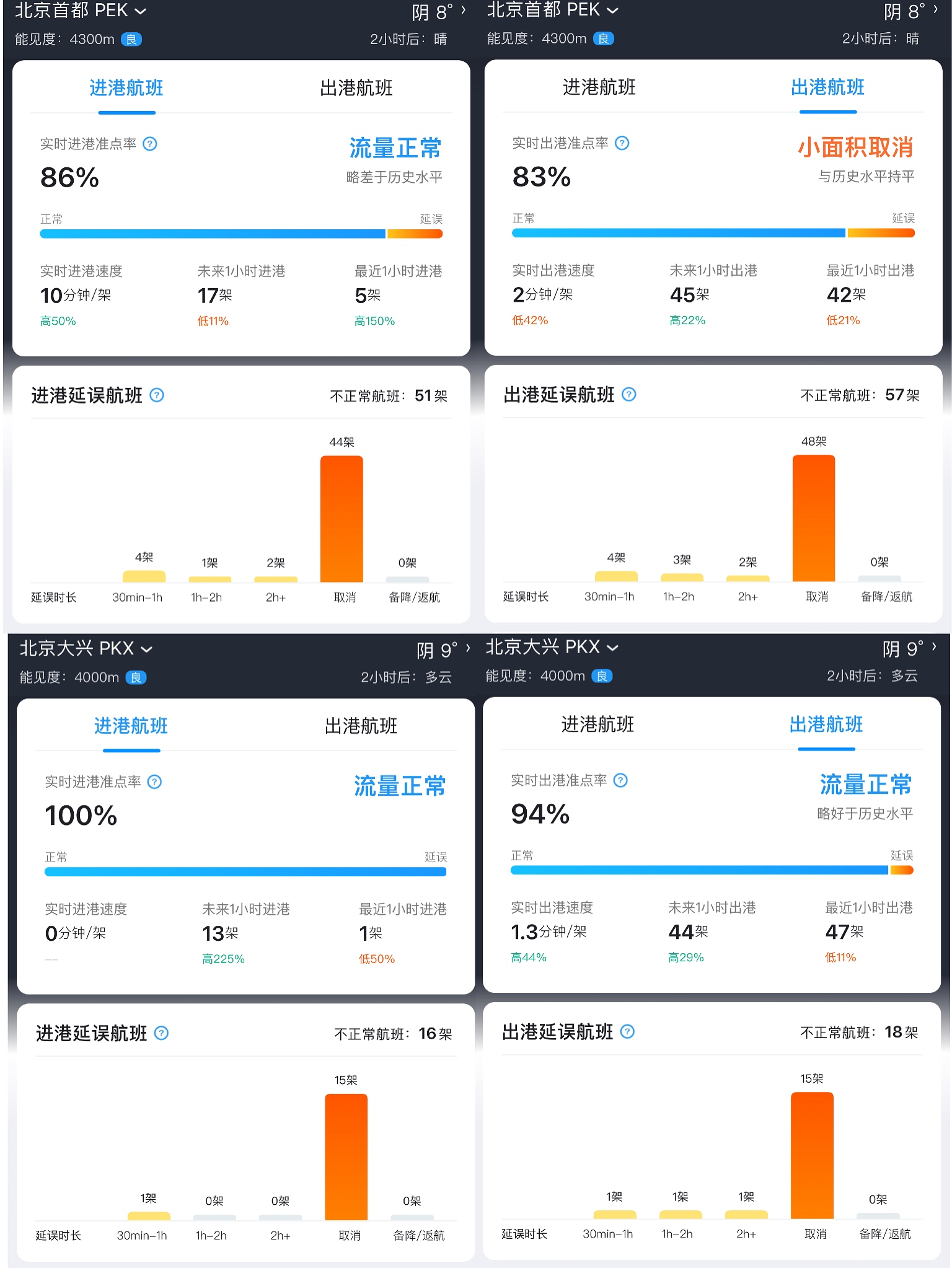 航班方面,飛常準APP顯示,截至發(fā)稿,北京首都機場進港航班流量正常,出港航班小面積取消;北京大興機場進港航班及出港航班,流量均正常。