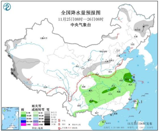 具體來看,今天,新疆南疆西部山區(qū)、西藏西部、西北地區(qū)東部、山西中部、東北地區(qū)北部等地的部分地區(qū)有小到中雪或雨夾雪,其中,西藏西部、新疆南疆西部山區(qū)等地局地有大雪或暴雪(10~18毫米)。西北地區(qū)東南部、黃淮南部、江淮、江漢、江南大部、西南地區(qū)東部、華南西部、海南島、臺灣島等地的部分地區(qū)有小到中雨,其中,江蘇東南部、上海等地局地有大雨(25~30毫米)。