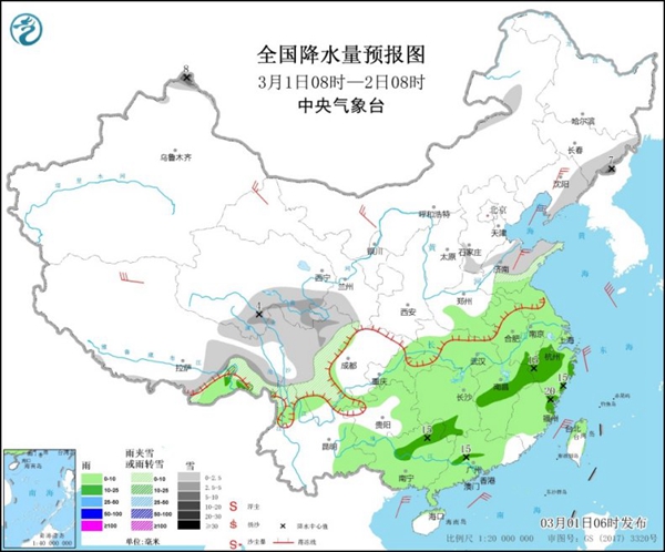中央氣象臺預(yù)計,今天北方的降水將明顯縮減,但南方依然有大范圍的降雨。預(yù)計,新疆北疆北部、東北地區(qū)東南部、山東大部、青藏高原東部等地的部分地區(qū)有小到中雪或雨夾雪,局地有大雪(5~8毫米)。西南地區(qū)東部、黃淮南部、江淮、江漢南部、江南、華南大部等地的部分地區(qū)有小雨或陣雨,局地中雨(10~20毫米)。