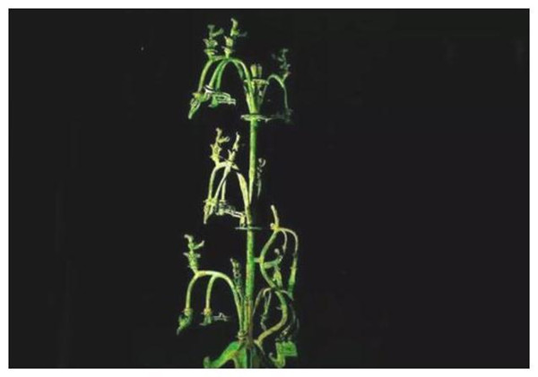 這顆青銅樹,高384公分,在專家把頂端的殘缺部分修復(fù)后,大概有5米之高,整顆樹木發(fā)綠,底部有一個與樹身大小相當(dāng)?shù)牡鬃?。樹干筆直,樹枝分為三層。每一層都有三根,共有9根,并且統(tǒng)一彎曲朝下。樹枝的中部有短樹枝延伸出來,在每根短樹枝的頂端都矗立著一只仰頭的小鳥,顯而易見,這是“九日居下枝”的現(xiàn)象。從而專家判定它并非是一顆普通的樹,后經(jīng)查閱歷史文獻,發(fā)現(xiàn)它和扶桑神樹的形狀十分吻合。因此,許多人把它稱為世界上最早的神樹。