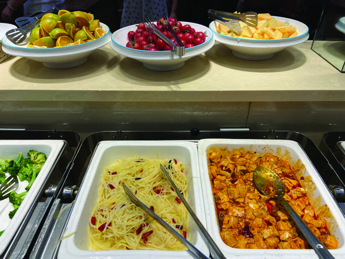 蒸菜炒菜、水果飲料、米面湯粥…… 9月2日中午,揚子晚報/紫牛新聞記者來到了南京市建鄴區(qū)的一家素食自助餐廳。一樓幾乎座無虛席,二樓的入座率大約是70%,有50人左右。 進入餐廳,映入眼簾的是一個醒目的長吧臺,不少顧客在此用公用夾子取餐。一側(cè)是炒素菜,有面筋、扁豆、青菜、茄子、豆腐、土豆絲等20余種。另一側(cè)以蒸煮菜為主,還有玉米粥、黑米粥、銀耳粥、酒釀元宵等各色湯粥。中間稍高的臺子上擺放著橙子、哈密瓜、圣女果等水果,除此之外還有七八種甜點以及十來種涼菜。 在吧臺兩側(cè),擺放著飲料和主食。這家店提供四種飲料,包括豆?jié){、玉米糊、酸梅湯等。主食有米飯、黑米飯、小花卷、蒸餃等。再向內(nèi)去,就是一個現(xiàn)做煎炸食品的吧臺,煎餃、煎豆腐、煎蔬菜餅很受歡迎。
