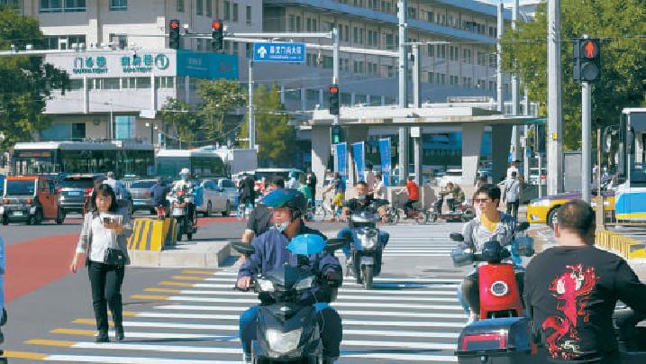 崇文門(mén)內(nèi)大街西側(cè)是北京醫(yī)院、同仁醫(yī)院,東側(cè)是居民區(qū),白天過(guò)馬路的行人絡(luò)繹不絕。下午3時(shí)30分,斑馬線(xiàn)上亮起綠燈,大部分電動(dòng)車(chē)通過(guò)斑馬線(xiàn)時(shí)卻絲毫沒(méi)有減速,不少想要過(guò)馬路的行人只能站在便道上等候。