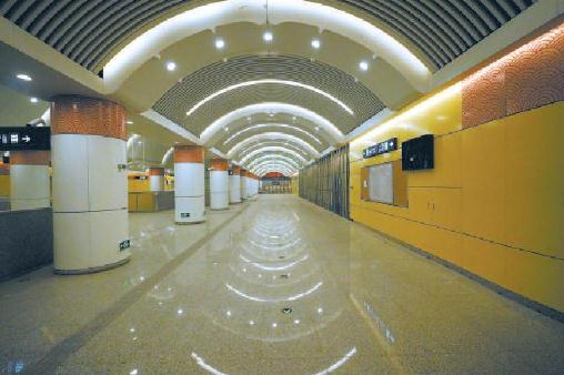 步入金魚胡同站,車站通道盡頭的墻壁設(shè)計(jì)成一座朱紅色大門的造型,一個個金黃色門釘古色古香。作為“地下中軸線”,這些站點(diǎn)的裝修獨(dú)具特色。全線裝修設(shè)計(jì)秉持“門觀中軸”的總體概念思想,以北京彩灰色系為基礎(chǔ),結(jié)合城市風(fēng)貌運(yùn)用裝修色彩,突出沿線地域特色,傳承歷史文化。車站也更重視換乘通道的設(shè)計(jì),運(yùn)用不對稱的裝修設(shè)計(jì)手法,將沉悶壓抑的狹長封閉空間營造為有“窗口”感的氛圍空間,增強(qiáng)了換乘通道的導(dǎo)向性,減輕狹長通道給人帶來的壓抑感。