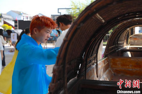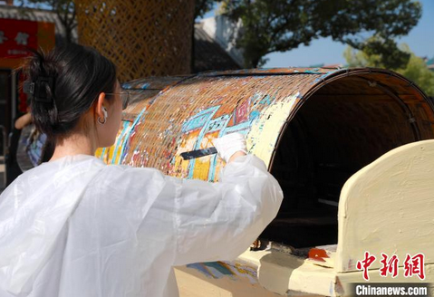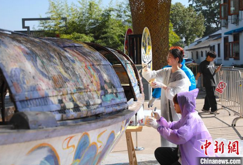 因篾篷漆成黑色而得名的烏篷船,被繪上彩色圖案會變成什么樣?10月31日,在魯迅外婆家——浙江省紹興市越城區(qū)孫端街道安橋頭村舉辦的2023年第二屆“水鄉(xiāng)社戲”開幕式上,來自國內(nèi)10所高校的“00后”青年學子相聚一堂,參與彩繪烏篷船比賽,用畫筆為烏篷船“上色”“添彩”。