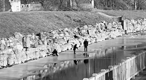 站在金中都南路輔路南側(cè)的橋上向下看,豐草河的河面上已有大面積的融化水域,僅剩靠近北岸邊三分之一的水面上還結(jié)著一層冰。此時(shí),一男一女兩個(gè)小孩就站在冰面上,伸著漁網(wǎng)在水中撈來(lái)?yè)迫?,還不時(shí)蹦來(lái)跳去。
